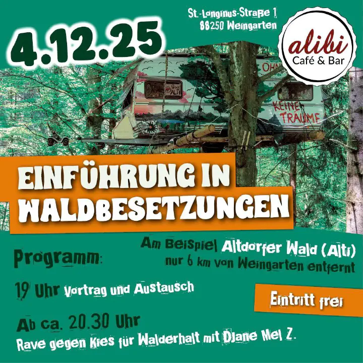 Veränderung, aber wie?! Unsre Zukunft - Unsre Wälder - Unser Leben Komm zu einem unvergesslichen Abend mit Rave ins Alibi Weingarten: Einführung in Waldbesetzungen Du wolltest schon immer wissen, wie das Leben im Wald in Baumhäusern so aussieht? Wir besetzen seit fast 5 Jahren ein Waldstück mit Baumhäusern gegen den drohenden Kiesabbau, den Altdorfer Wald (Alti) 6 km von Weingarten. 19 Uhr Vortrag und Austausch 20.30 Uhr “Rave gegen Kies” - mit DJane Mel Z.