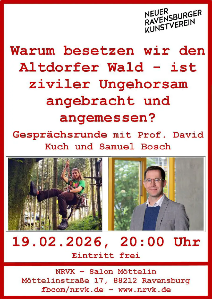 Do. 19.2. 20 Uhr – Neuer Ravensburger Kunstverein Thema: “Warum besetzen wir den Altdorfer Wald – ist ziviler Ungehorsam angebracht und angemessen?” mit Samuel Bosch und Prof. David Kuch. Weiter Infos: https://www.nrvk.de/warum-besetzen-wir-den-altdorfer-wald-ist-ziviler-ungehorsam-angebracht-und-angemessen/