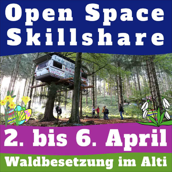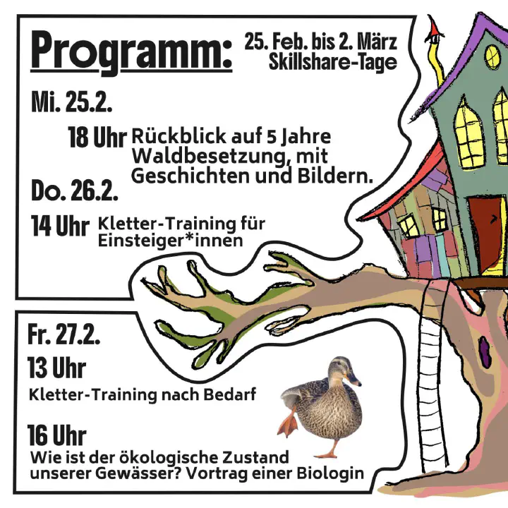 Programm der Skillsharetage von Mittwoch, 25.02.-02.03. in der Waldbesetzung im Altdorfer Wald Folgt uns auch auf Telegram: http://t.me/s/altdorfer_wald🌲🌳