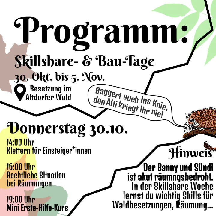Programm: Skillshare- & Bau-Tage 30. Okt. bis 5. Nov. 📍 Besetzung im Altdorfer Wald 🦔 Hinweis: Der Banny und Sündi ist akut räumungsbedroht! In der Skillshare-Woche lernst du wichtige Skills für Waldbesetzungen, Räumung, Aktivismus… Donnerstag, 30.10. 14:00 Uhr – Klettern für Einsteiger*innen 16:00 Uhr – Rechtliche Situation bei Räumungen 19:00 Uhr – Erste-Hilfe-Kurs Freitag, 31.10. 12:00 Uhr – Klettern für Einsteiger*innen 14:00 Uhr – FINTA*-Baumhaus winterfest machen 17:00 Uhr – Vortrag: „Evolution und die Geschichte des Lebens“