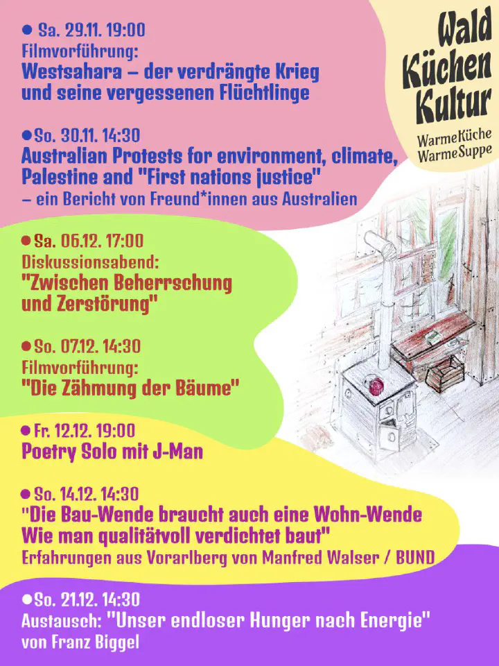Unser Wald Küchen Kultur Programm: Sa. 29.11. 19:00 Filmvorführung: Westsahara – der verdrängte Krieg und seine vergessenen Flüchtlinge So. 30.11. 14:30 Australian Protests for environment, climate, Palestine and “First nations justice” – ein Bericht von Freund*innen aus Australien Sa. 06.12. 17:00 Diskussionsabend: “Zwischen Beherrschung und Zerstörung” So. 07.12. 14:30 Filmvorführung: “Die Zähmung der Bäume” Fr. 12.12. 19:00 Poetry Solo mit J-Man So. 14.12. 14:30 “Die Bau-Wende braucht auch eine Wohn-Wende