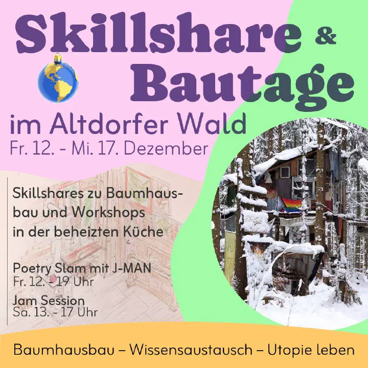Vom 12. bis 17. Dezember rufen wir zu Winter-Skillshare und Bau-Tagen 🪚❄️🌲auf. Es gibt zahlreiche Workshops in unsrer beheizten Küche.🫶 Kommt vorbei und bringt euch ein. Die Skillsharetage sind ein Open Space, in den sich jede*r einbringen kann. 🌱 Falls ihr wollt, das etwas im Programm angekündigt wird, schreibt uns gerne vorher. Am Freitag, 12.Dezember gibt’s um 19Uhr Poetry Slam mit J-MAN Packt euren Schlafsack, Klettergurt (gibt’s aber auch kommunal vor Ort) und eure Isomatte ein und kommt vorbei.