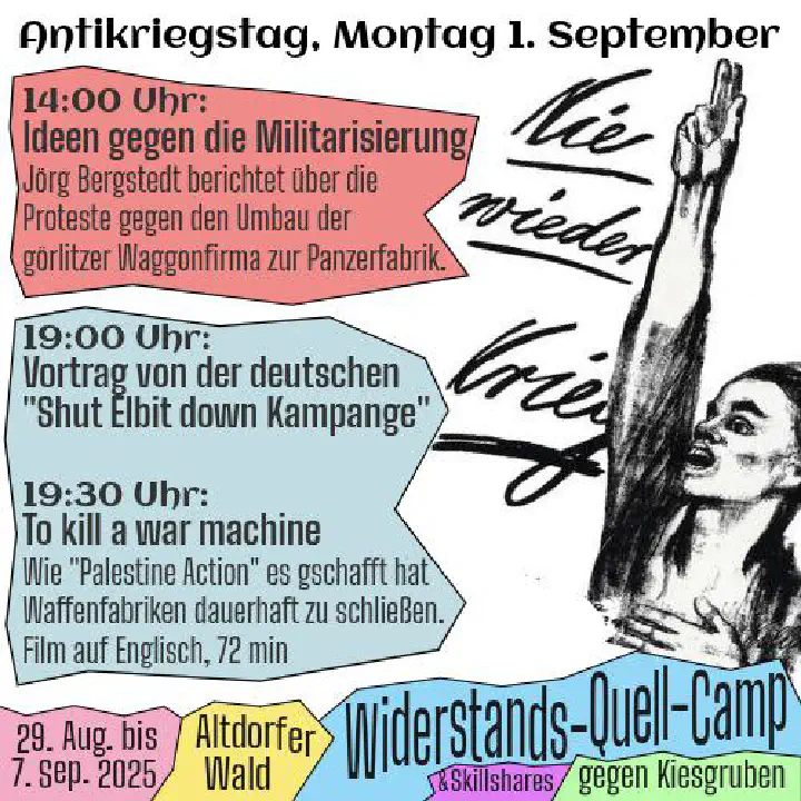 Antikriegstag Montag 1. September 14:00 Uhr: Ideen gegen die Militarisierung Jörg Bergstedt berichtet über die Proteste gegen den Umbau der Waggonfirma in Görlitz zur Panzerfabrik https://krieg.siehe.website und https://panzerfabrik.siehe.website. 19:00 Uhr: Input von der deutschen shut elbit down Kampange 19:30 Uhr: Film: To kill a war machine Wie Palestine Aktion es gschafft hat Waffenfabriken dauerhaft zu schließen. Film ist auf Englisch 72 min