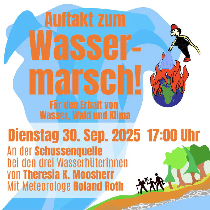 Bad Schussenried/Schussenquelle Datum: Dienstag, 30.09. um 17:00Uhr Ort: an der Schussenquelle/Bad Schussenried Die Auftaktkundgebung des Wassermarsches für den Erhalt von Wasser, Wald und Klima steht nun fest. Bei den drei Wasserhüterinnen Skulpturen von Theresia K.Moosherr. Sie selbst als Wasserhüterin und auch Meteorologe Roland Roth werden die Auftaktveranstaltung bereichern. Sei dabei!!!! Zum Schutz unseres kostbaren Trinkwassers - ein hohes und wertvolles Gut! Unser Wassermarsch startet am 02.10.2025-05.10.2025💦👣🥾👟👞 Sei dabei ob alle Tage, einzelne Tage, einzelne Stunden…