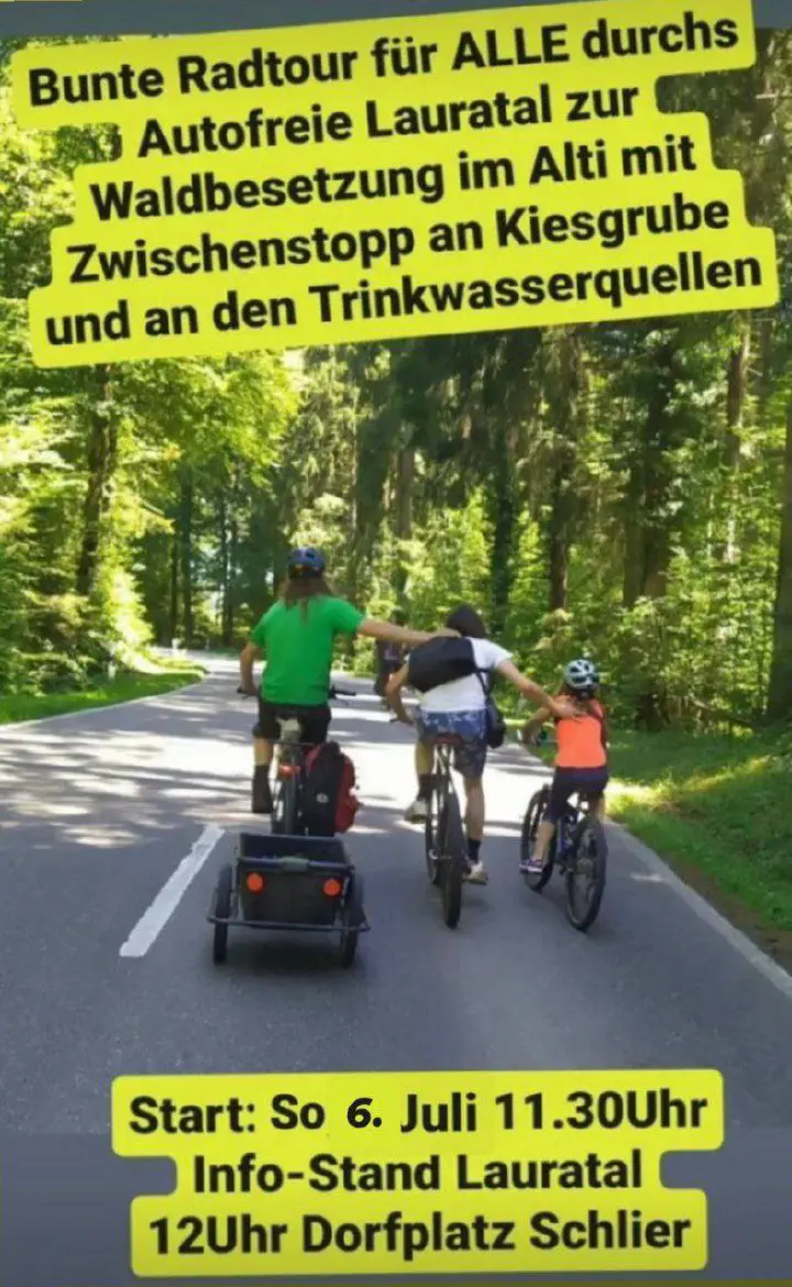 Gemeinsame Radtour für ALLE zur Waldbesetzung im Altdorfer Wald (Alti)🌳🚲 Am Sonntag (6.Juli 25) Start: 11.30 Uhr Info-Stand (unterer Eingang Lauratal) Wir machen zwei kurze Zwischenstopps: -bei der bestehenden Kiesgrube ✊🏼bei Oberankenreute -Trinkwasserquelle 💦im Altdorfer Wald (bringt gerne eine Flasche zum Abfüllen des erfrischenden Quellwassers mit). Ziel unserer Radtour: Waldbesetzung im Alti. Dort wird es für Interessierte einen Rundgang durch das Baumhausdorf geben.🌲🏠🌳 Strecke: 13km (einfache Strecke), ⬆️317hm Dauer: ca. 2 Stunden