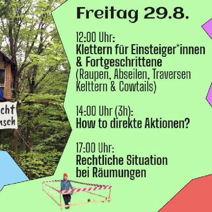 Bauen, Lernen, Utopie und ein Konzert 📆 Do. 8. Mai - So. 11. Mai Lasst uns den Kiesbaronen und den Politikern zeigen, dass unsere Zukunft nicht verkäuflich ist. Zwischen einigen 💡🧗♀️Skillshares zum Klettern und 🔨 Weiterbauen der Baumhäuser bleibt viel Zeit um neue Freundschaften mit coolen Leuten zu schließen oder die nächste Aktion auszutüfteln. ✨ Ladet alle eure Freunde ein! 💤🏕 Schlafplätze gibt es in Baumhäusern, und wir haben eine Zeltwiese.