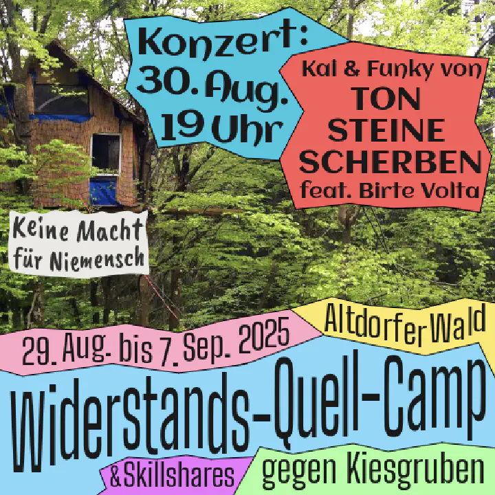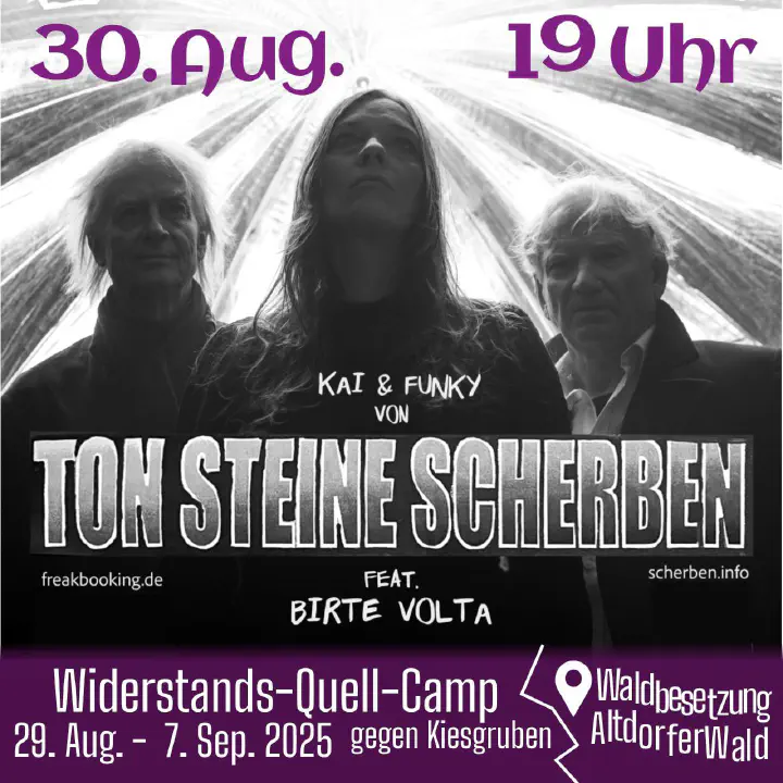 Widerstands-Quell-Camp 29.8.-7.9. im Altdorfer Wald Konzert von Kai & Funky von TON STEINE SCHERBEN feat. Birte Volta am Samstag, 30. August, 19 Uhr 🎼🎸🎤 Kommt in die Besetzung im Altdorfer Wald und lasst uns zusammen ausgelassen feiern und tanzen.🎉 Wer kennt sie nicht TON STEINE SCHERBEN: Utopien und Texte zum Tanzen, Nachdenken und Grenzen sprengen. “Keine Macht für Niemand!” Das Konzert findet auf Spendenbasis statt. ALLE sind Willkommen!!!!💫🌈🎼 Bringt euch gerne Getränke mit und seid so lieb die Flaschen und entstandenen Müll danach wieder mit nach Hause zu nehmen!