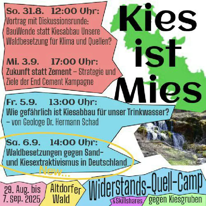 Alle Inputs rund um Kies während des Widerstands-Quell-Camps. Sonntag, 31.8. 12:00Uhr Vortrag mit Diskussionsrunde: Bauwende statt Kiesabbau. Unsere Waldbesetzung für Klima und Quellen? Mittwoch, 3.9. 17:00Uhr Zukunft statt Zement - Strategie und Ziele der End Cement Kampagne Freitag, 5.9. 13:00Uhr Wie gefährlich ist Kiesaabau für unser Trinkwasser -Geologe Dr. Hermann Schad Neu: Samstag, 6.9. 14:00Uhr Waldbesetzungen gegen Sand- und Kiesextraktivismus in Deutschland Das komplette Programm findest du unter :https://alti-bleibt.de/blog/widerstands-quell-camp/