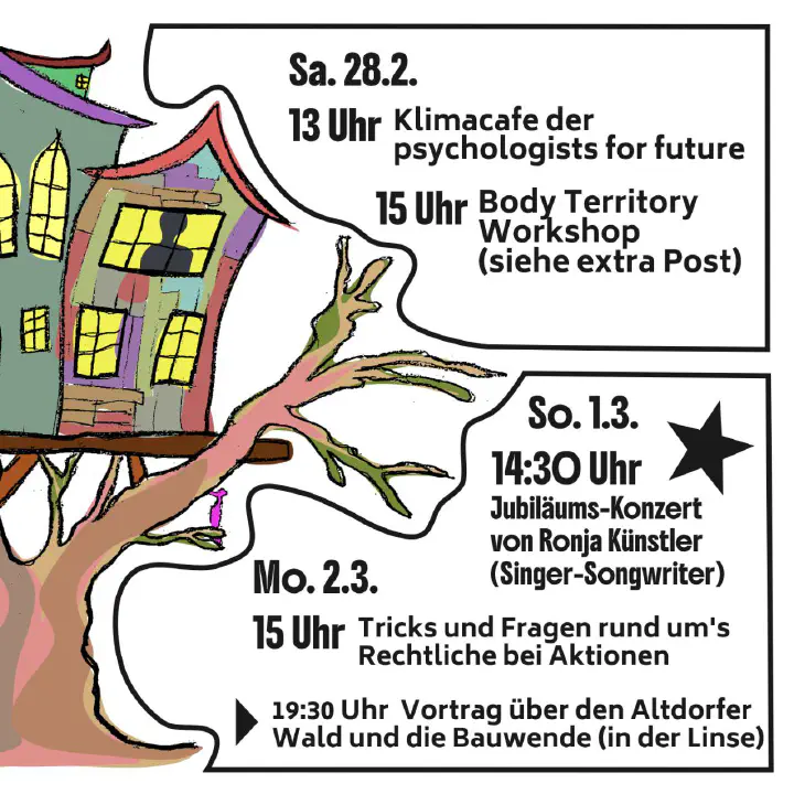 Programm der Skillsharetage von Mittwoch, 25.02.-02.03. in der Waldbesetzung im Altdorfer Wald Folgt uns auch auf Telegram: http://t.me/s/altdorfer_wald🌲🌳