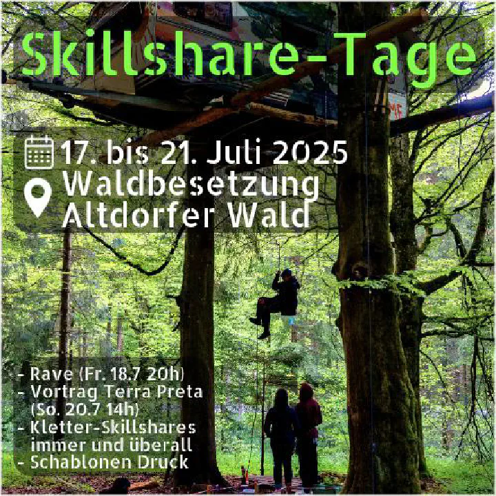 Vom 17. bis 21. finden die Sommer-Skillshare Tage im besetzten Altdorfer Wald statt. Es erwarten Euch ein Anti-Kies-Rave, ein Vortrag zu “Terra Preta”, Textil-Schablonen-Druck, Kletterskillshares und viele weitere spannende Angebote zu Aktionen oder was Menschen spontan anbieten. Die Tage sind als offener Raum geplant. Ihr könnt Euch gerne vorher melden, wenn ihr Euer Projekt vorstellen wollt, oder etwas teilen wollt, oder einfach so vorbeikommen. Wir freuen uns auf Euch.