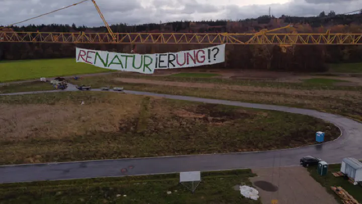 Schlier: Kran-Protest – Renaturierung nur schwer möglich Flächenversiegelung durch “Gewerbegebiete auf der grünen Wiese” und “völlig unzureichende Ausgleichsflächen” – darauf machten am 20.11.2023 kletternde Klimaaktivist*innen aufmerksam. Ihre Kritik brachten sie auf einem Banner mit der Aufschrift “Renaturierung?!” zum Ausdruck, das sie am Ausleger eines der Baukräne im neu entstehenden Gewerbegebebiet Wetzisreute-Ost in der Gemeinde Schlier [1a,1b] anbrachten. “Der geplante Natur-Ausgleich ist lange nicht ausreichend - und was von den Plänen letztlich realisiert wird, ist offen”, sagt Hannah Schak (18), eine der Aktivistinnen.